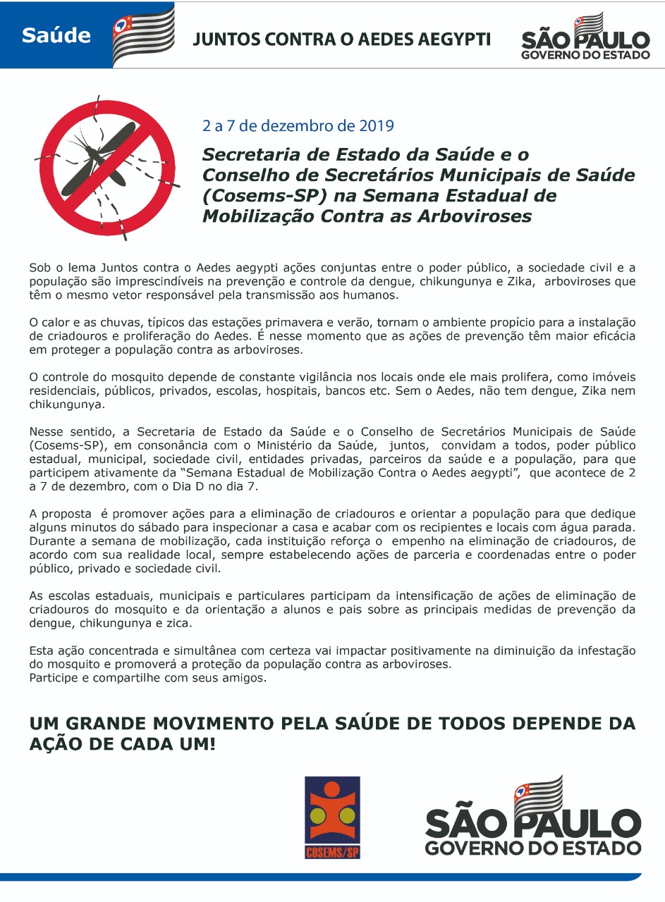 Semana Estadual de Mobilização Contra as Arboviroses, de 2 a 7 de dezembro. Participe! Carta conjunta: Secretaria de Estado da Saúde e Conselho de Secretários Municipais de Saúde - Cosems-SP