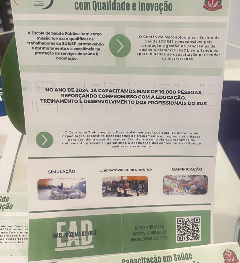Essas ações reforçam o compromisso da Escola de saúde pública junto com a Secretaria de Estado da Saúde com a qualidade da formação e o desenvolvimento contínuo dos profissionais de saúde.