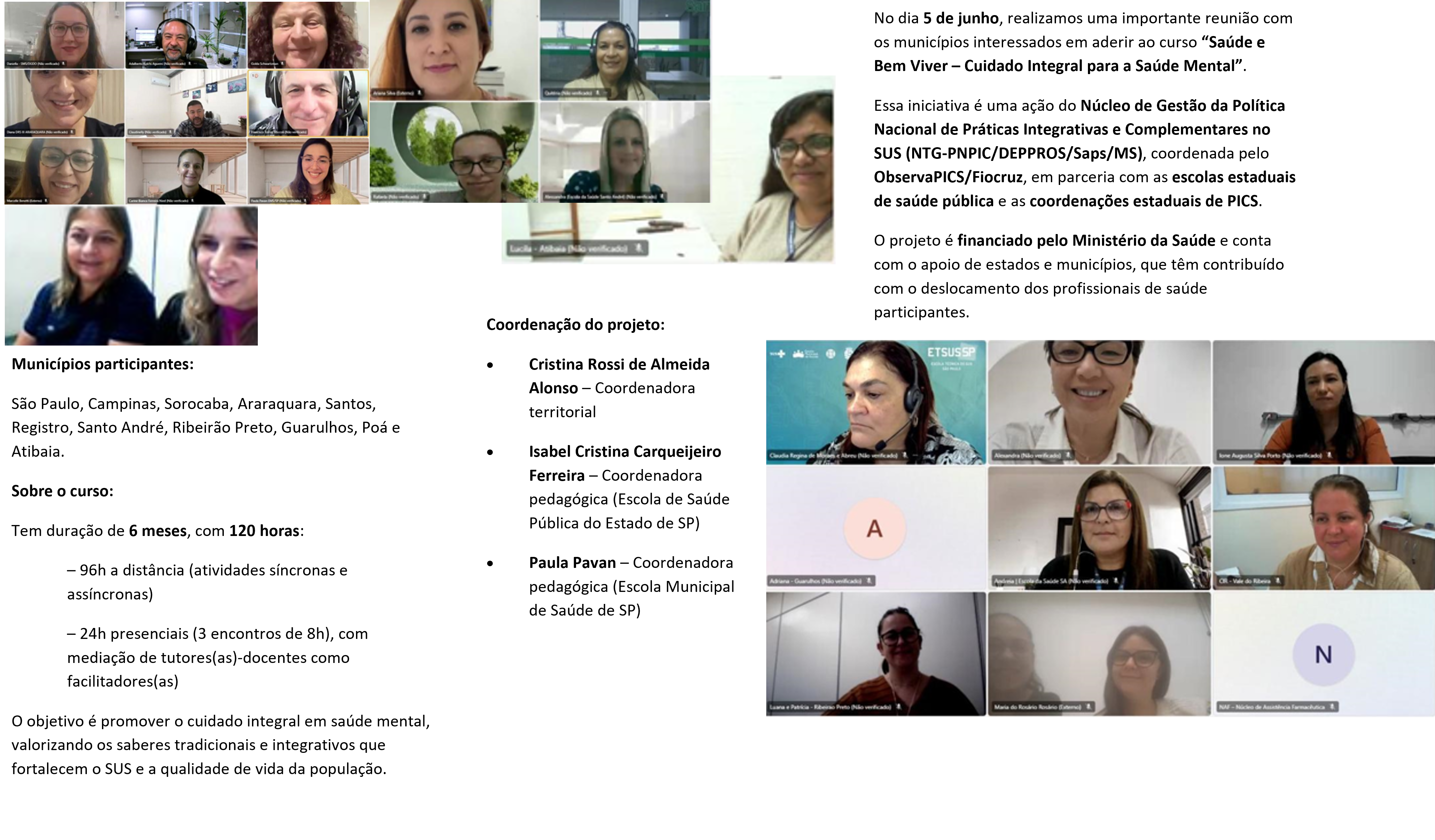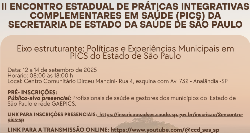 Com 120 horas de duração, o curso combina atividades presenciais e teóricas no Ambiente Virtual de Aprendizagem Moodle EAD/SES, e tem como objetivo fortalecer as práticas de autocuidado, saúde mental e Práticas Integrativas e Complementares em Saúde (PICS) nos municípios participantes e regiões do estado de São Paulo.