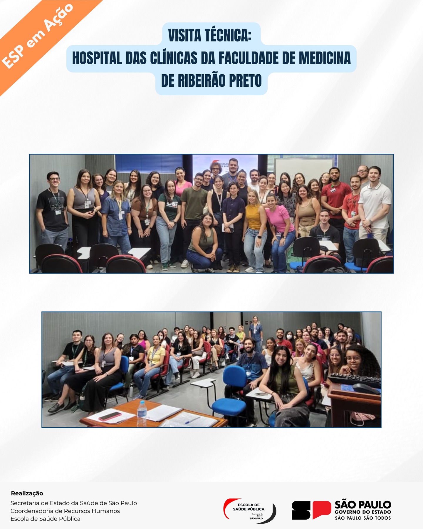 Dando continuidade ao cronograma de visitas técnicas realizadas semestralmente pela Escola de Saúde Pública, da Coordenadoria de Recursos Humanos da Secretaria de Estado da Saúde de São Paulo, estivemos no Hospital das Clínicas da Faculdade de Medicina de Ribeirão Preto.