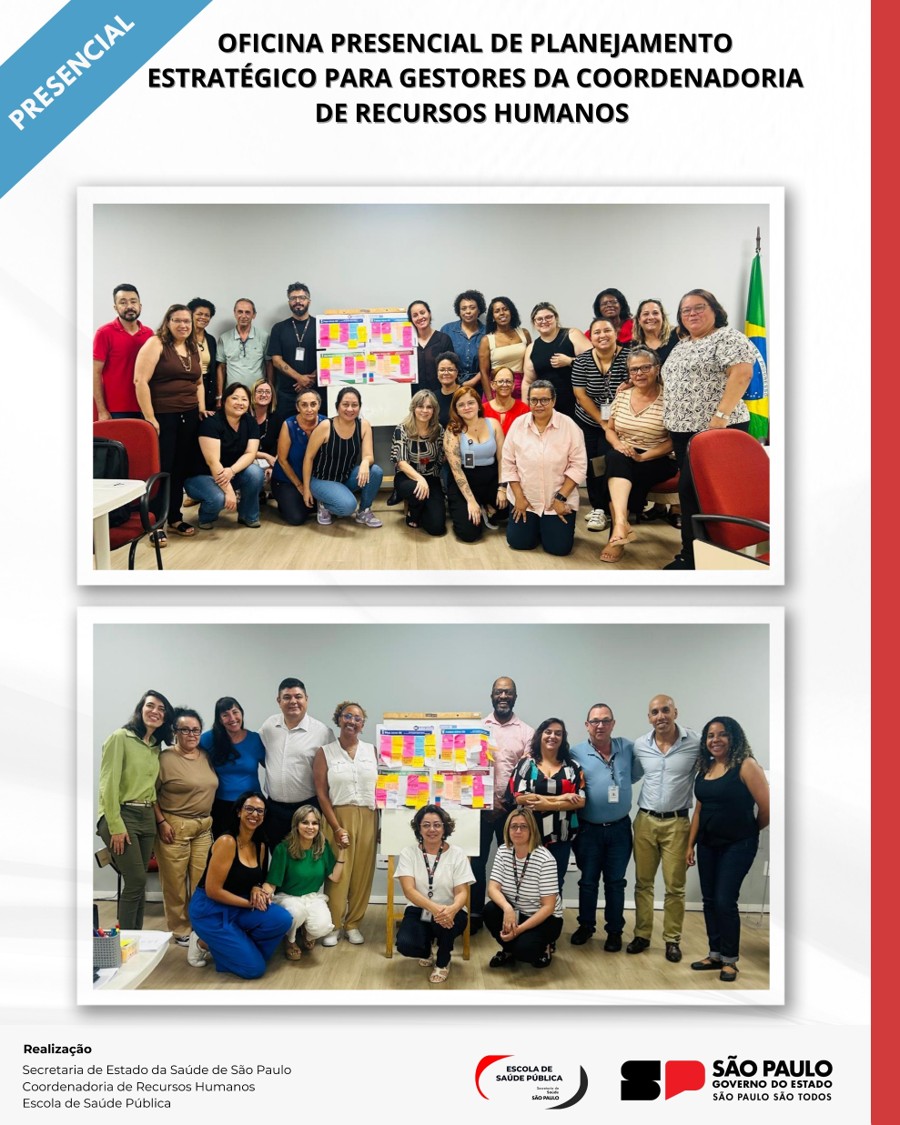 Nos dias 13 e 14 de janeiro de 2026, a Coordenadoria de Recursos Humanos (CRH/SES-SP) realizou Oficinas de Planejamento Estratégico, demandadas pela coordenadora Sandra Siqueira Lima e conduzidas pela Escola de Saúde Pública, sob a coordenação da diretora Edna Duarte, representando a diretora Andrea Cotait junto com a técnica Cristina Rossi de A. Alonso. Com a participação dos diretores de todas as áreas técnicas da CRH, a iniciativa teve como objetivo vivenciar, de forma participativa e aplicada, métodos e ferramentas do Planejamento Estratégico Situacional (PES), apoiando a análise dos problemas estratégicos, a construção de Planos de Ação e a pactuação de estratégias de acompanhamento e monitoramento.