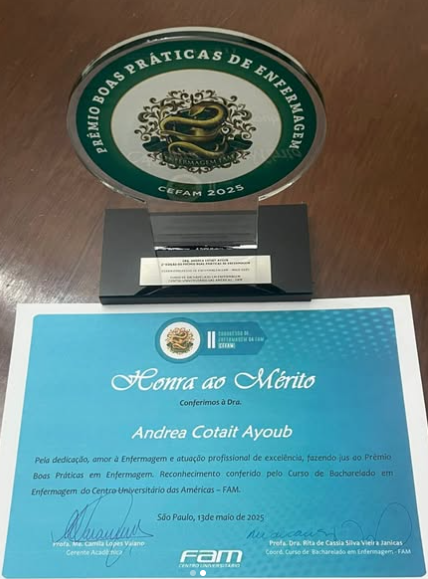 No mês em que se comemora o Dia Internacional da Enfermagem, a homenagem é ainda mais especial. Com uma trajetória marcada pela ética, dedicação e amor à profissão, nossa Diretora foi reconhecida com duas importantes honrarias: o Jaleco Dourado, concedido pelo Coren-SP, e uma taça da Faculdade das Américas (FAM), ambas em reconhecimento ao seu papel de liderança e contribuição à Enfermagem e à saúde pública.