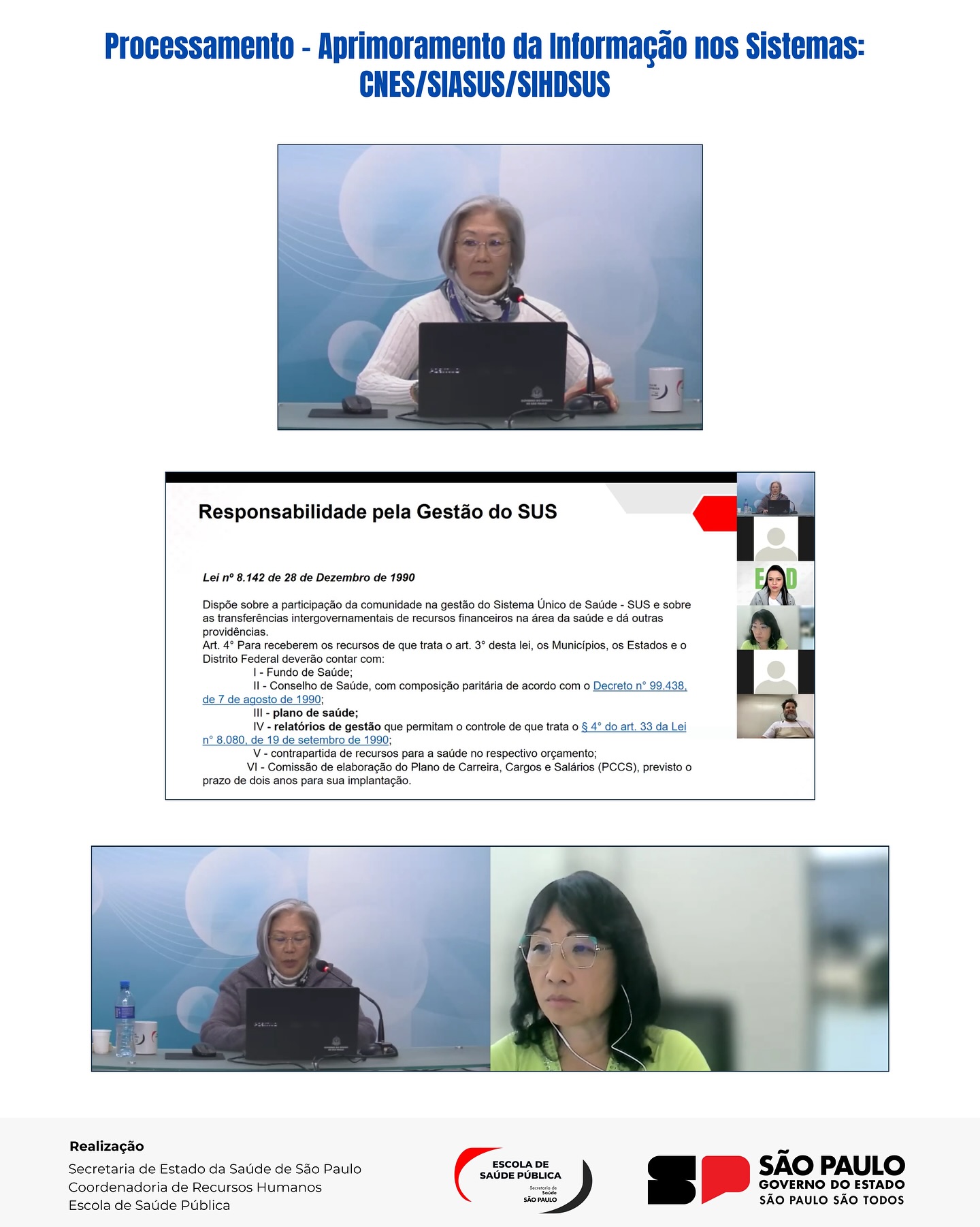 A coordenação executiva foi conduzida pela Me. Cristina Rossi de A. Alonso, junto com a técnica Vanessa da Silva Nascimento, e contou com um corpo docente qualificado da Escola de Saúde Pública, além de convidados e especialistas da SES/SP e externos.