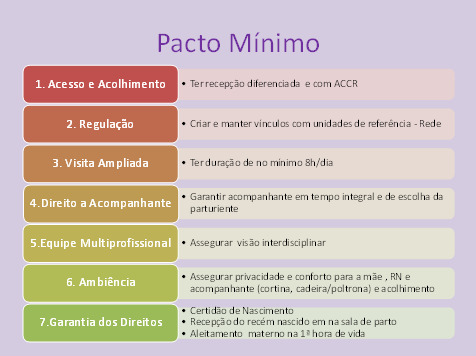 A Política Estadual de Humanização propõe como pacto mínimo para Humanização da assistência ao parto, a implementação dos seguintes dispositivos: