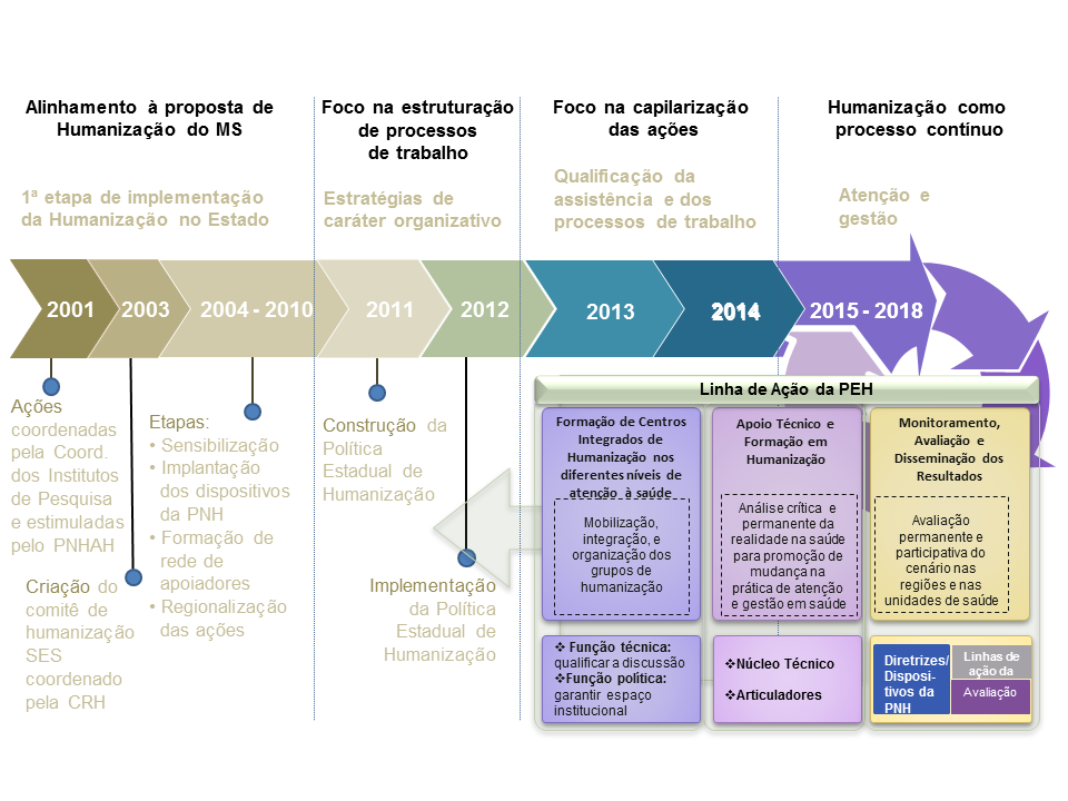 Em 2012 foi dado início ao processo de implementação da PEH no estado. Neste período o principal foco foi a estruturação dos processos de trabalho em Humanização. Para tanto, foram realizados o lançamento oficial da PEH, a contratação de Articuladores Regionais de Humanização, a publicação de Resoluções e a criação de ferramentas de apoio (Matriz para elaboração de Planos de Intervenção, Formulário de levantamento de ações de humanização, Pesquisa de Satisfação do Usuário etc.).