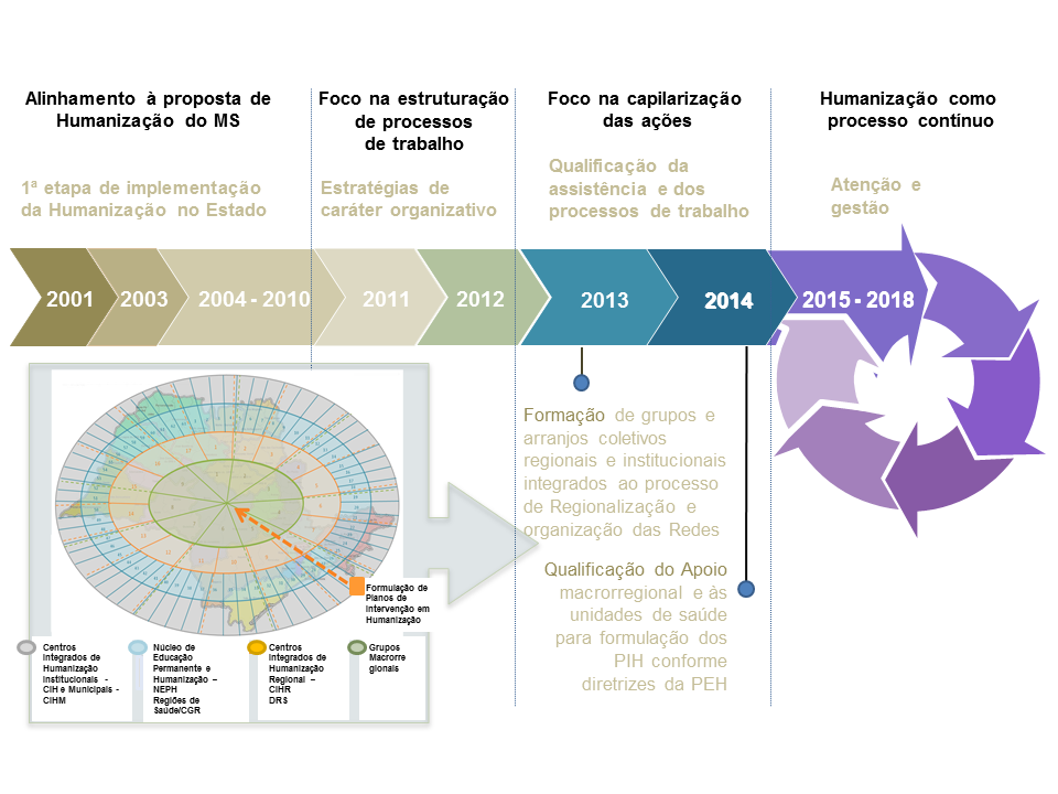 Em 2014, ainda com foco na capilarização das ações, foram implementadas estratégias de qualificação do apoio macrorregional e às unidades de saúde para formulação dos Planos de Intervenção em Humanização, conforme diretrizes da PEH. Para tanto, foram realizadas ações visando à continuidade do trabalho junto às unidades de saúde - hospitais e Ambulatórios Médicos de Especialidades - AMES, e intensificação do apoio regional em Humanização junto aos municípios priorizados.
