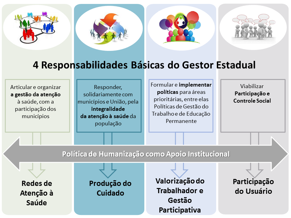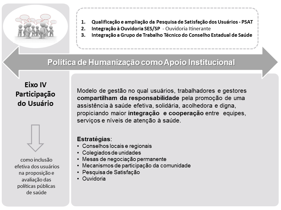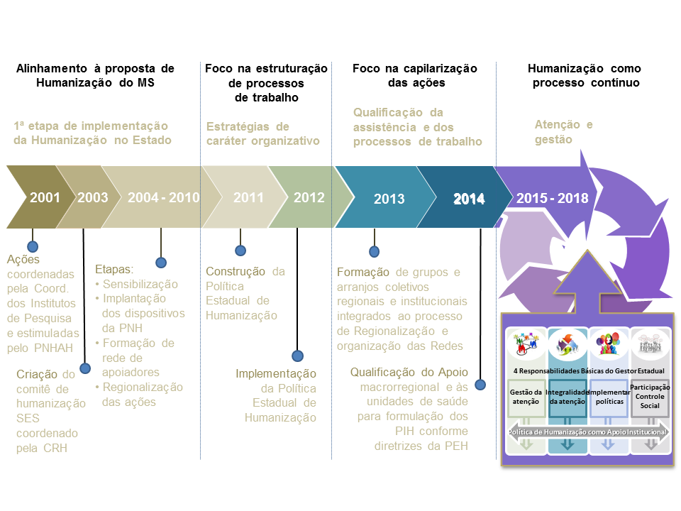 A partir de 2003, ano de criação da Política Nacional de Humanização - PNH e de sua implementação nos vários estados da federação, a Secretaria de Saúde do Estado de São Paulo dá início a um novo percurso de trabalho em humanização que percorre quatro etapas interdependentes: sensibilização de gestores e trabalhadores para a questão da humanização; formação de profissionais da saúde para conhecimento conceitual e metodológico de implementação das diretrizes e os dispositivos específicos da PNH; constituição da rede de apoiadores em humanização por meio da realização de curso de Formação de Apoiadores da Política de Humanização em parceria com o Ministério da Saúde e o Departamento de Medicina Preventiva da Universidade de São Paulo; e produção de movimento de capilarização e regionalização das ações de humanização.
