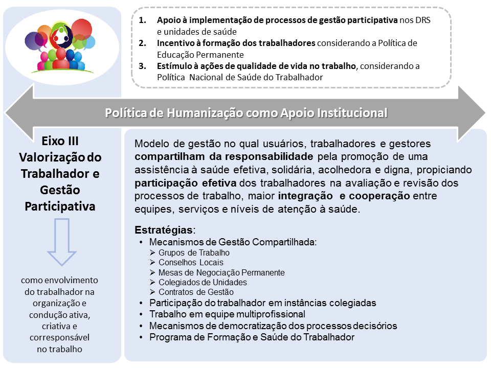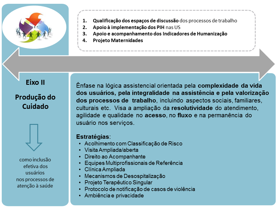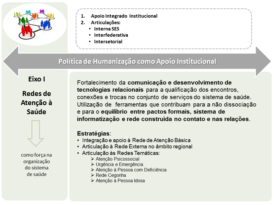 A proposição dos Eixos Temáticos 2015 2018 tem como objetivos facilitar a organização do trabalho por grandes temas e promover a integração dos principais movimentos e ações de Humanização em sua complexidade, sem, no entanto, desconsiderar a interconexão e interdependência entre eles. São eles: Redes de Atenção à Saúde, Produção do Cuidado, Gestão Participativa, Valorização do Trabalhador e Gestão Participativa, e Participação do Usuário.