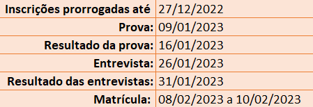 • Segunda fase:  análise de currículo, prova oral e entrevista, com caráter eliminatório e classificatório, prevista para o dia 26 de janeiro de 2023.